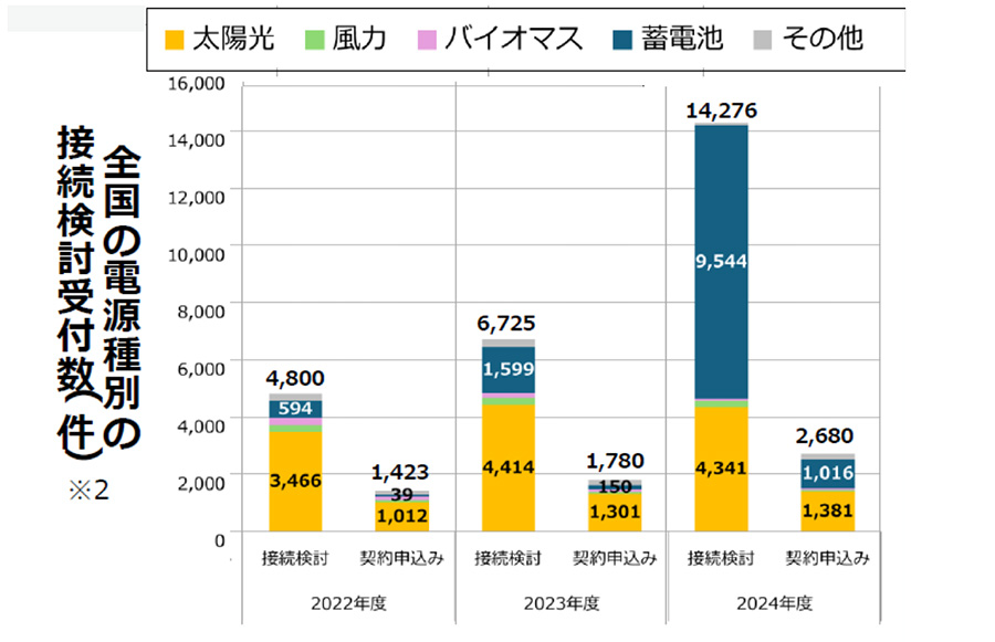 2022年度以降、系統用蓄電池の参入が急速に拡大している。図1は資源エネルギー庁の「次世代電力・ガス事業基盤構築小委員会」資料からの抜粋だが、送電線への接続検討申込み数、ならびに送電系統への接続契約数がともに急増していることがわかる。