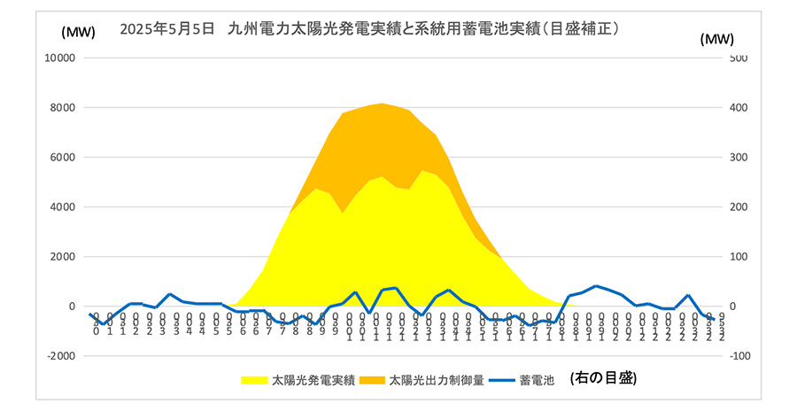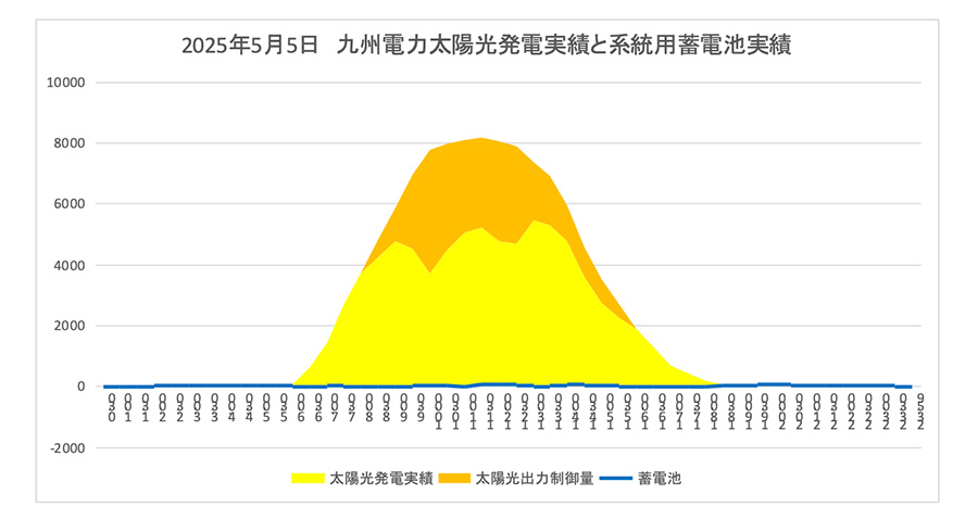 図8 2025年5月5日九州電力 太陽光発電 蓄電池実績グラフ