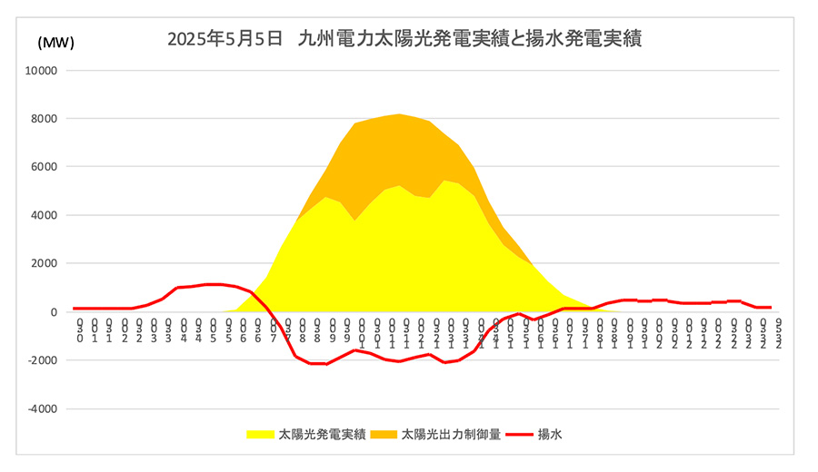 図2 2025年5月5日九州電力 太陽光発電、揚水式発電実績グラフ