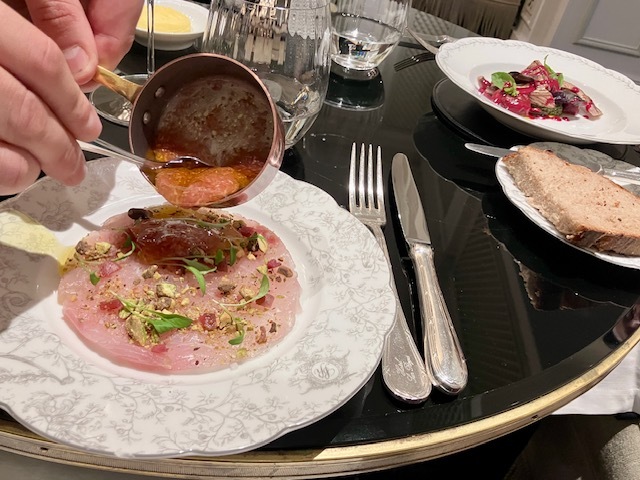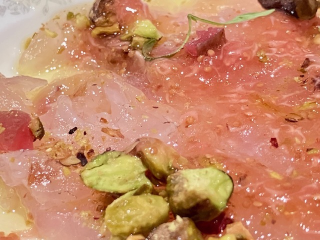 鯛のセヴィーチェはむっちり厚めの身の食感よく、合わせたイチジクヴィネグレットとの相性が絶妙。白身にマンゴーとか柑橘合わせることは多々あれど、イチジクは初めて。甘酸っぱさがなんともいい感じで、ふわっと香るコリアンダーとカリッカリの上質なピスタチオがよいアクセント。