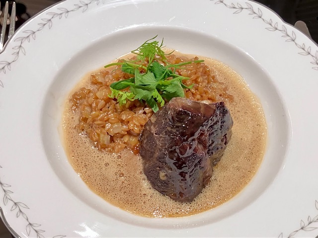 主菜は、今日の定食料理のトロトロ牛頬&レモン風味のエプートルのリゾット。上品でさっぱりしたおいしさで、ぺろっと食べ終わる。