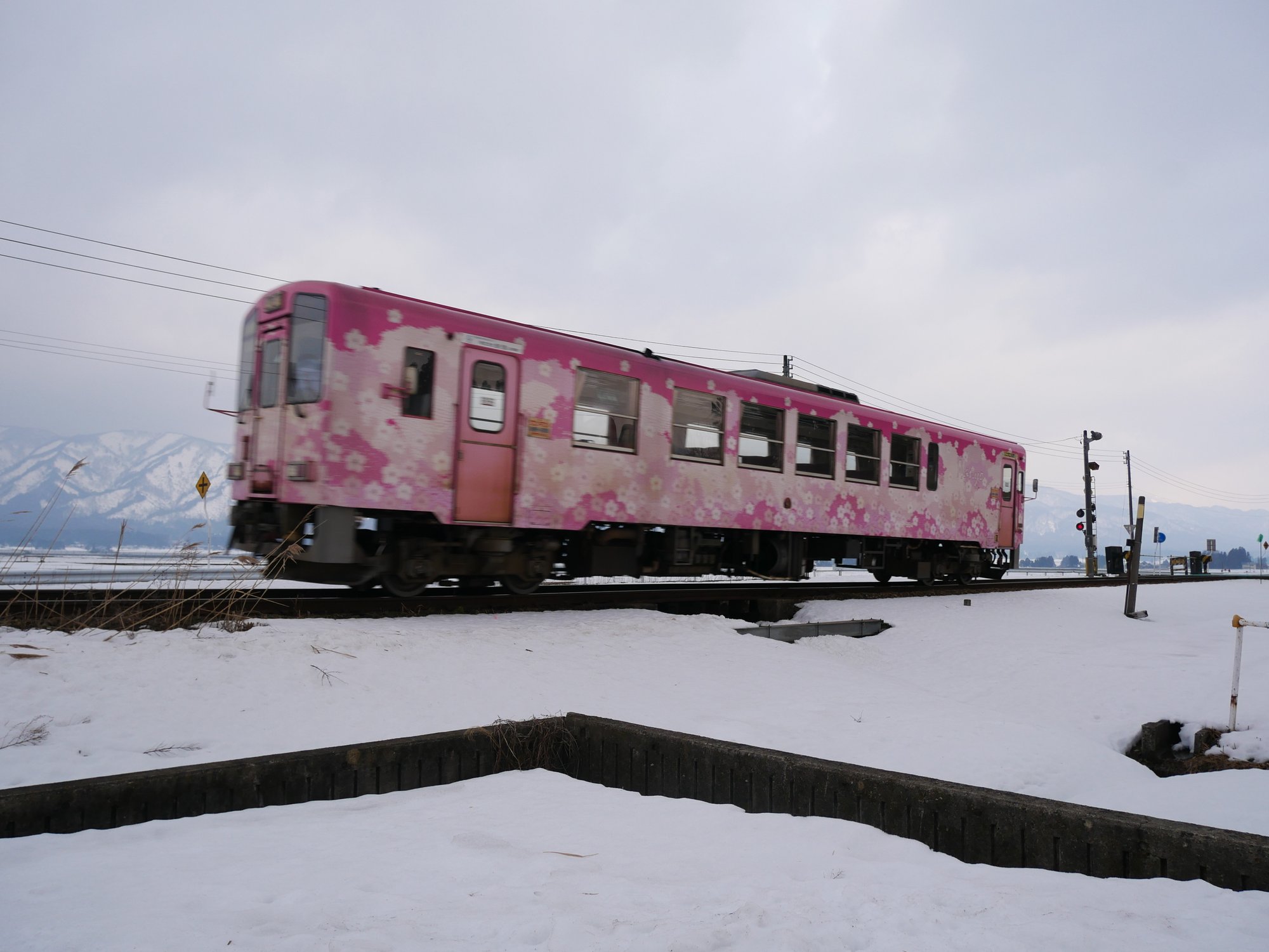 山の写真を撮っていたら、1両の列車が通り過ぎていきました。こちらが今回のブログの主役、山形鉄道フラワー長井線です。山形新幹線の赤湯駅と、白鷹町の荒砥駅を結ぶローカル線は1913年に長井軽便線として開業、その後国有化されましたが、利用者の減少に悩み、JR東日本に移管された直後の1988年に第三セクターの山形鉄道に移管されました。もとは国鉄であったため、国鉄時代の駅舎がまだ残っている駅があり旅人の郷愁を誘っています。