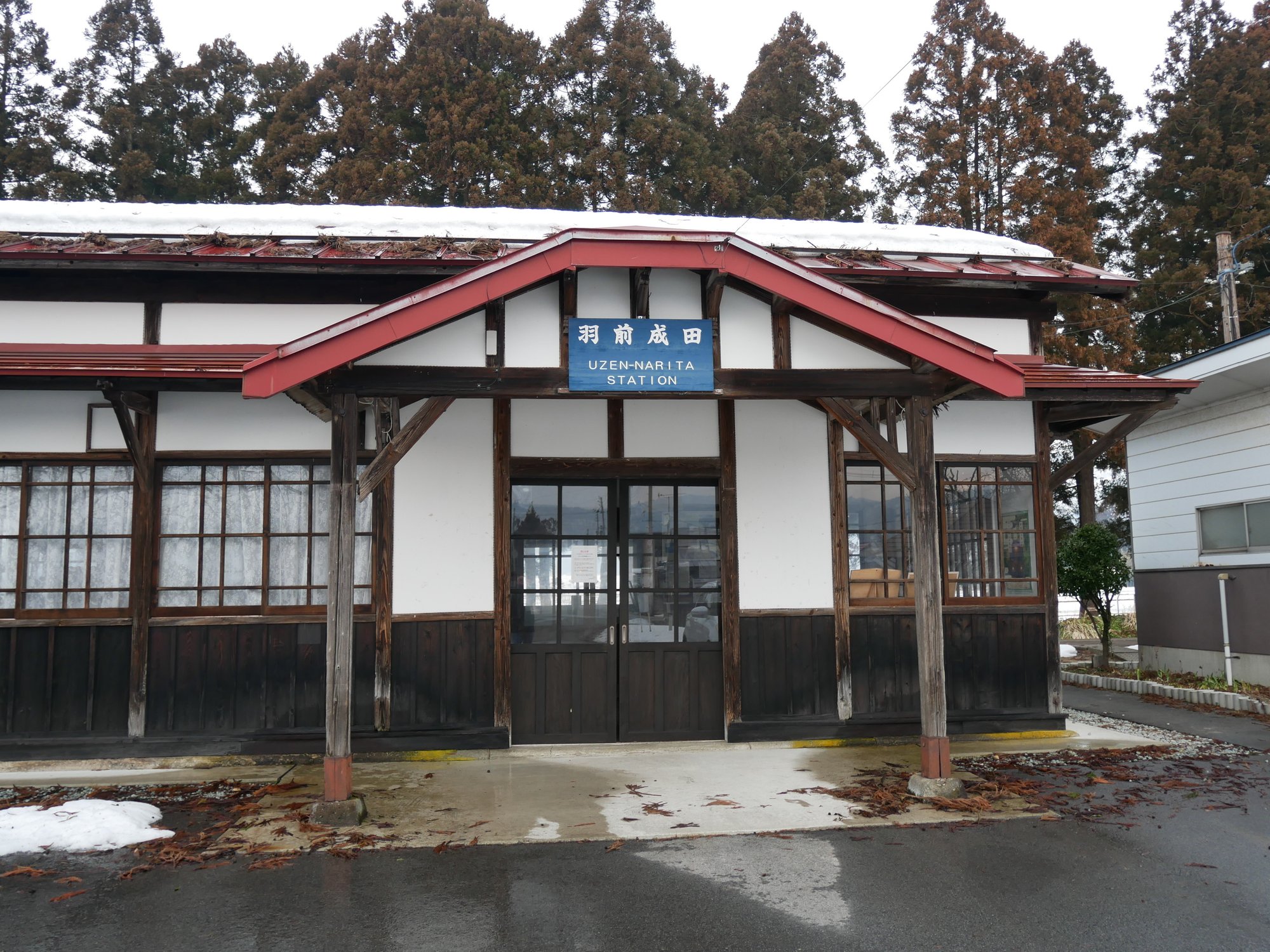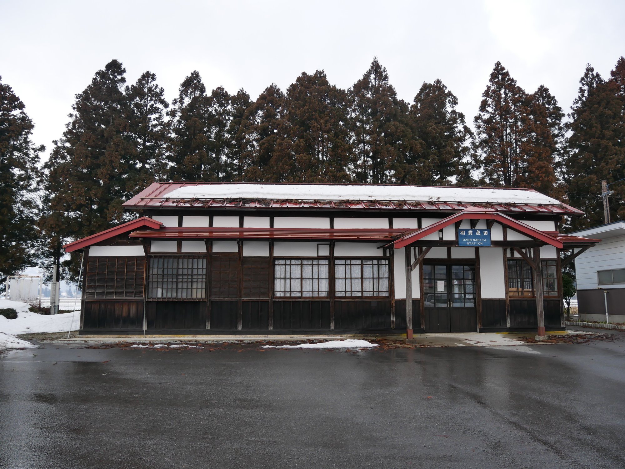 沿線の長井市内のホテルから20分ほど歩いて一目見たかった木造駅舎にやってきました。こちらは羽前成田駅。1922年に長井線が延伸された際に開業しました。100年以上の歴史のある駅で、その保存の良さから国の登録有形文化財に指定されています。かつてはこのタイプの駅舎が沿線の随所に見られたのですが老朽化が進んで新しく建て替えられました。