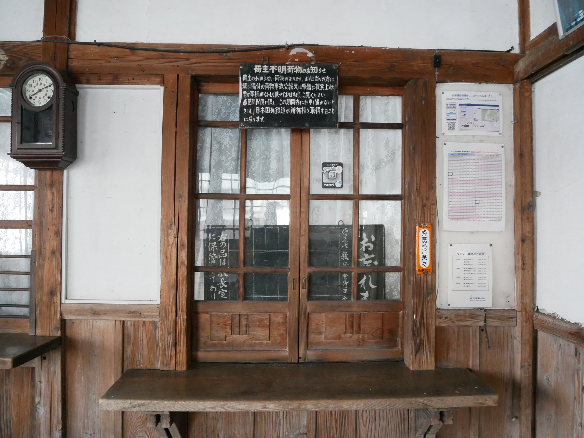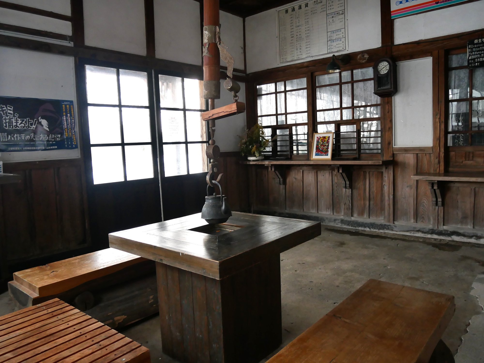 羽前成田駅の魅力は、木の扉をくぐった中にもあります。囲炉裏のようなテーブルやチッキ、切符売り場がそのまま残されており、まるで昭和のテーマパークかと思ってしまいます。