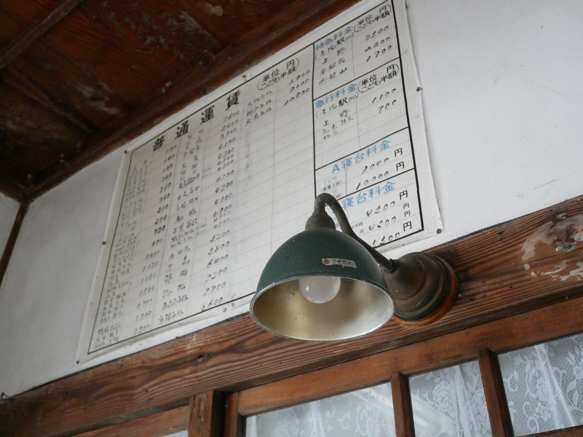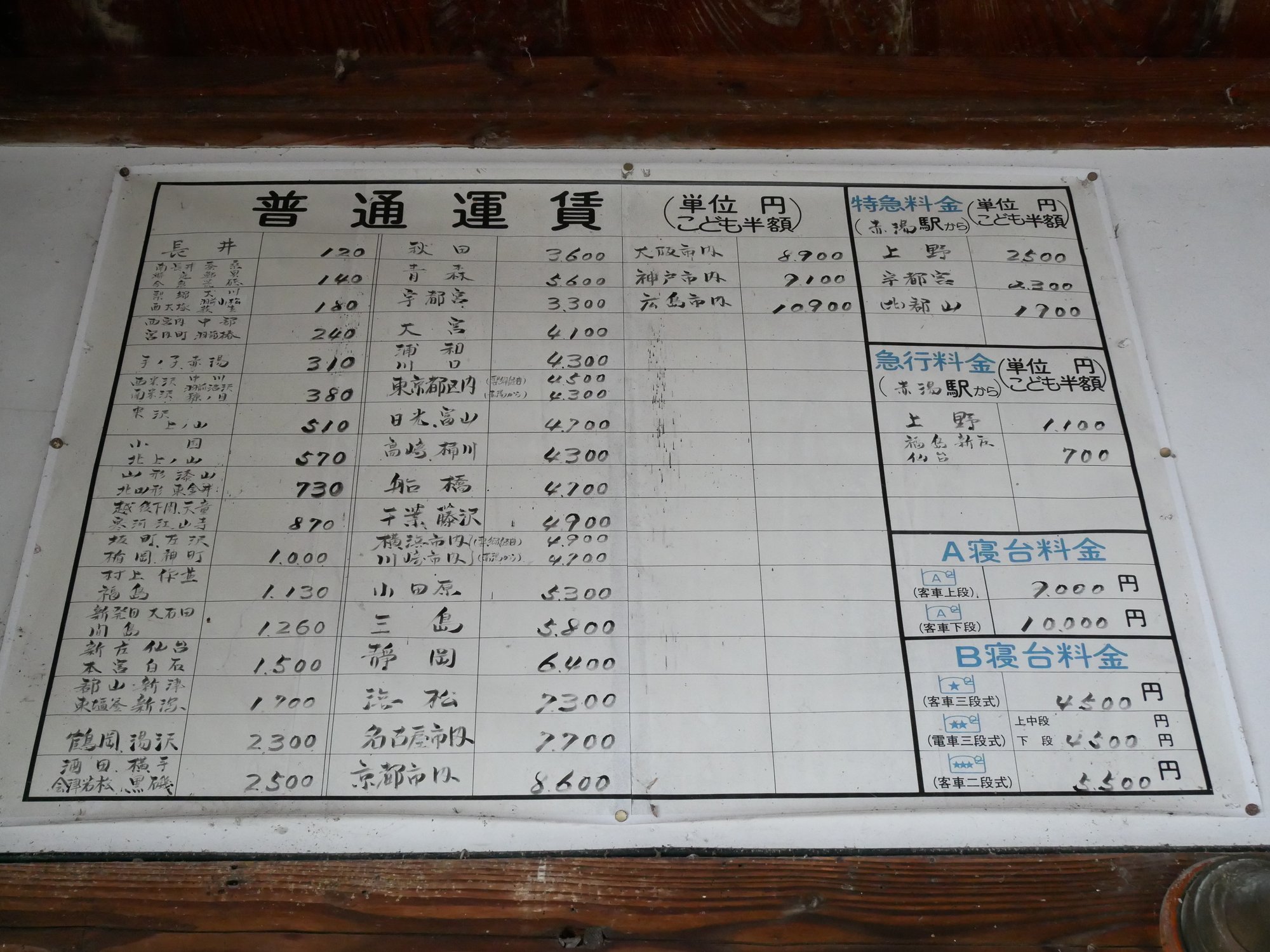 さらに、こちらは国鉄時代の運賃表。近隣の駅や主要駅までの運賃や特急料金、寝台料金の掲示があります。かつて赤湯駅を経由して走っていたエル特急つばさややまばと、寝台特急あけぼのなどの列車に思いを馳せます。