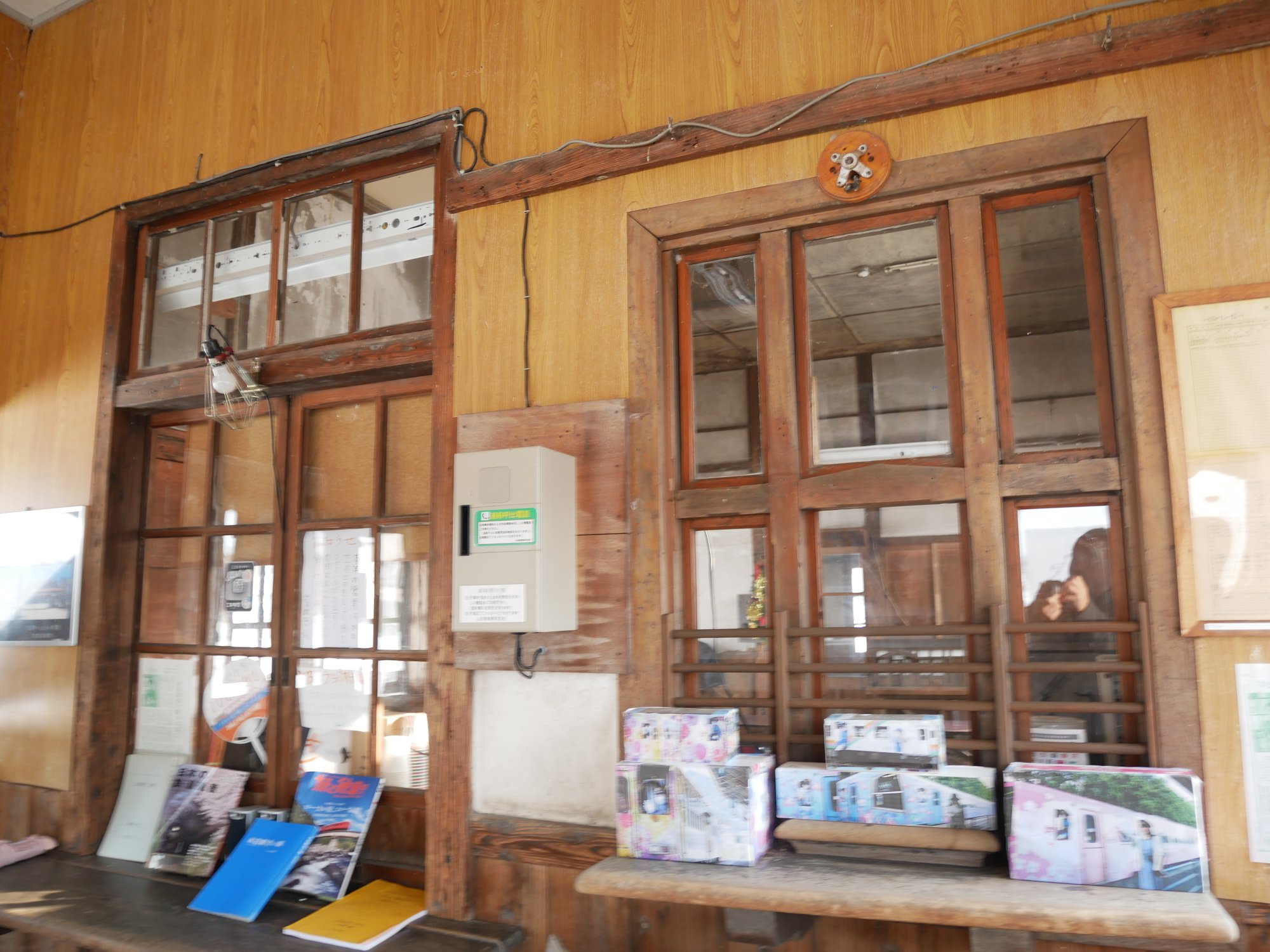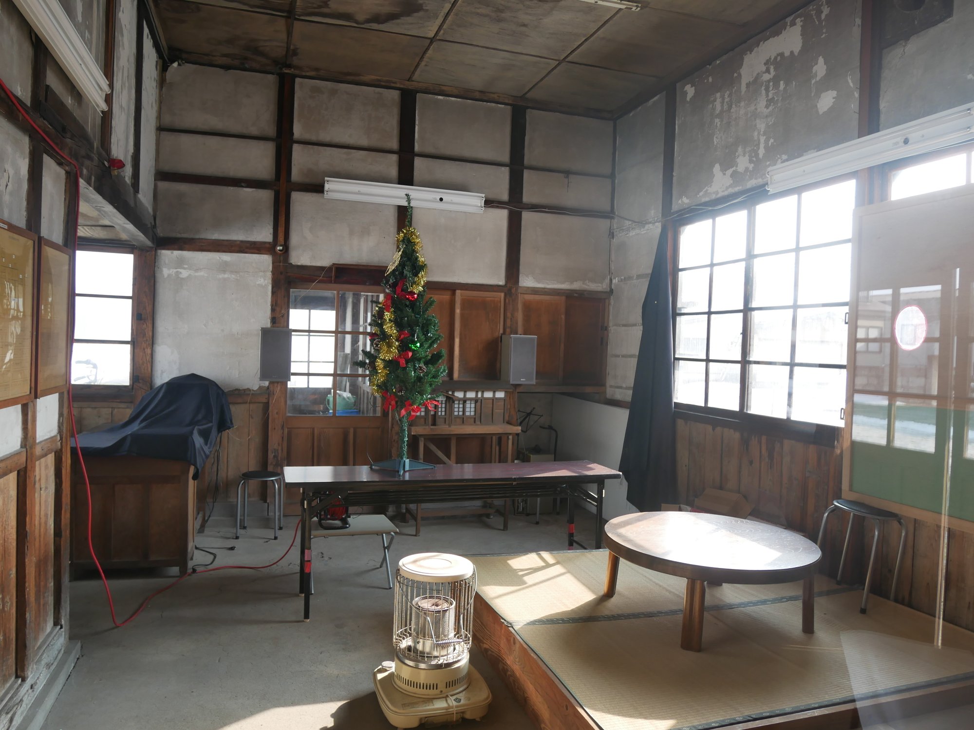 きっぷ売り場の向こうをのぞいてみると、かつて駅員さんが使っていたんでしょうか、畳スペースなどがあります。今日は使われていなかったのですが、一般に開放されている日もあるようです。クリスマスツリーが妙に新しいので何かイベントをしたのかもしれません。