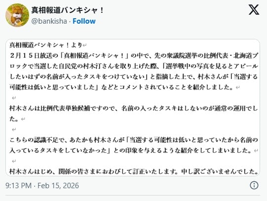 15日放送の日本テレビ系報道番組「真相報道バンキシャ!」をめぐり、衆院選の比例代表候補の扱いを巡る編集が問題となり、選挙制度の理解と報道のあり方を問う議論が広がっている。
