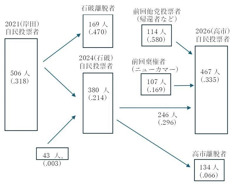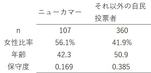 帰還者とニューカマーを合わせて221人となり、全自民党投票者の5割を占めている。彼らは高市氏が引き出した支持者である。