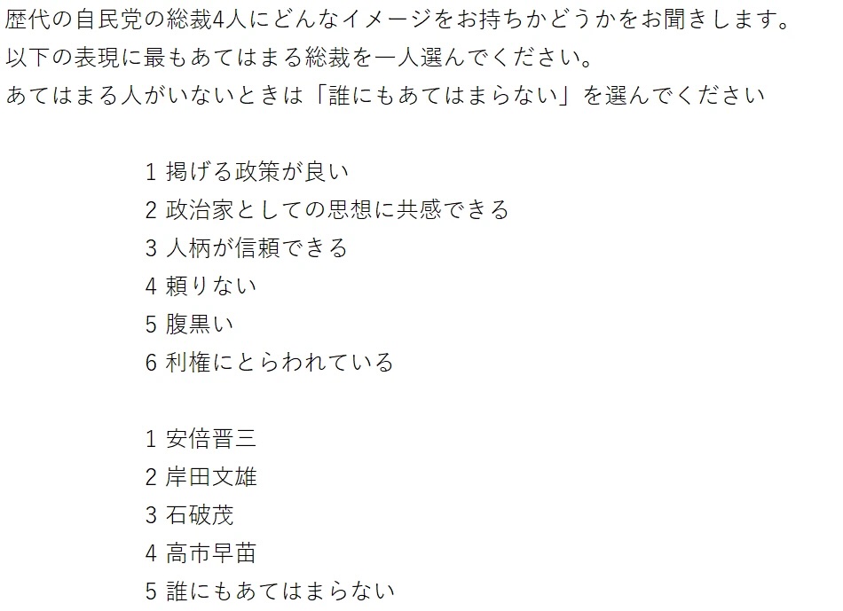 この設問は、「誰にも当てはまらない」という選択肢があるとはいえ、4人並べてその中からあてはまる人を選んでもらっているので、積極的に相手の人柄がよいとか、あるいは腹黒くないとか評価しているわけではない。あくまで4人の総裁経験者の相対的な評価である。また、旧立憲民主党支持者・共産党支持者は石破氏への評価が高く、高市氏への高い評価は出てこない。