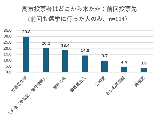 高市自民に加わったもう一つの投票者は前回棄権していた人である。前回は投票所に足を運ばなかった人107人が自民党に投票しており、これも自民党投票者の2割程度をしめている。自民党にとっては新しい支持者を堀りおこしたことになり、ニューカマーとでも呼ぶべきであろう。