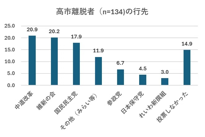 しかし、この目論見は失敗した。図1-4はこの高市離脱者の投票先である。これを見ると、離脱者の中で、中道改革連合に投票した人は20.9%で2割しかいない。維新の会、国民民主党へ同じく2割程度流れており、チームみらいにも1割流れている。中道改革連合が中道を狙うなら、この離脱者の半分程度は取れればよかっただろうがそうはなっていない。