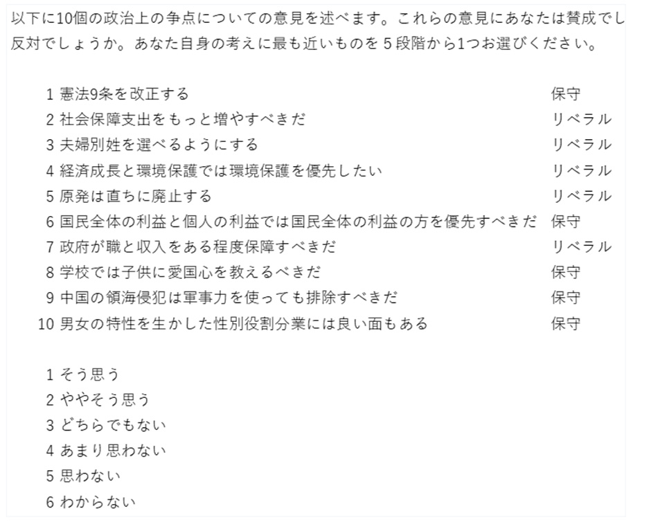 捕捉図1-1のように10個の政治的意見への賛否を尋ね、そう思うから思わないまで5段階で答えてもらった。