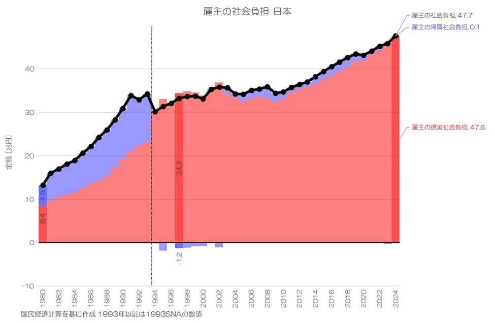雇主の現実社会負担が多くを占めることになりますが、日本経済のピークとなった1997年では34.4兆円だったのが、2024年には47.6兆円と13.3兆円拡大している事になります。