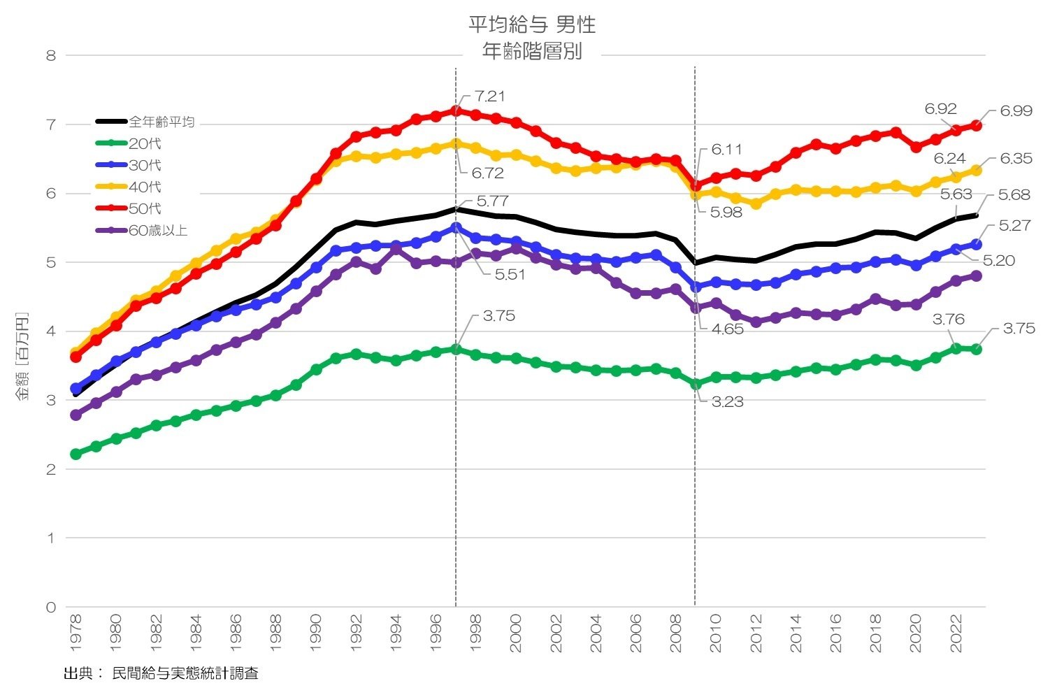 もちろんこの間、男性現役世代の雇用者は減り、女性と高齢の雇用者が増えていて、その多くはパートタイム労働者となりますので、平均値が下がりやすい状況だったことになります。