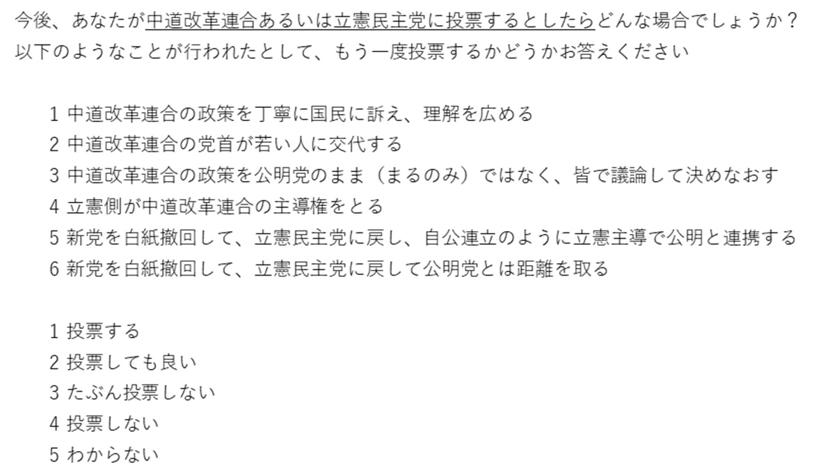 3以降の公明党との関係を見直すと3割を越えるようになり、6の新党を「白紙撤回して立憲民主党に戻す」と、4割を越える人が復帰すると答えている。これを見ると離脱の主因は公明と合流した点にあると思わざるをえない。