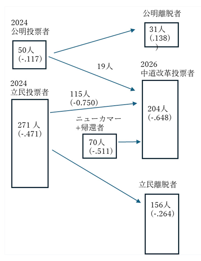 まず、公明党の投票者50人のうち、31人が中道改革に投票していない。中道改革に投票した人は4割の19人のみで、6割の31人が離脱している(グラフで表すと図2-2左がそれである)。