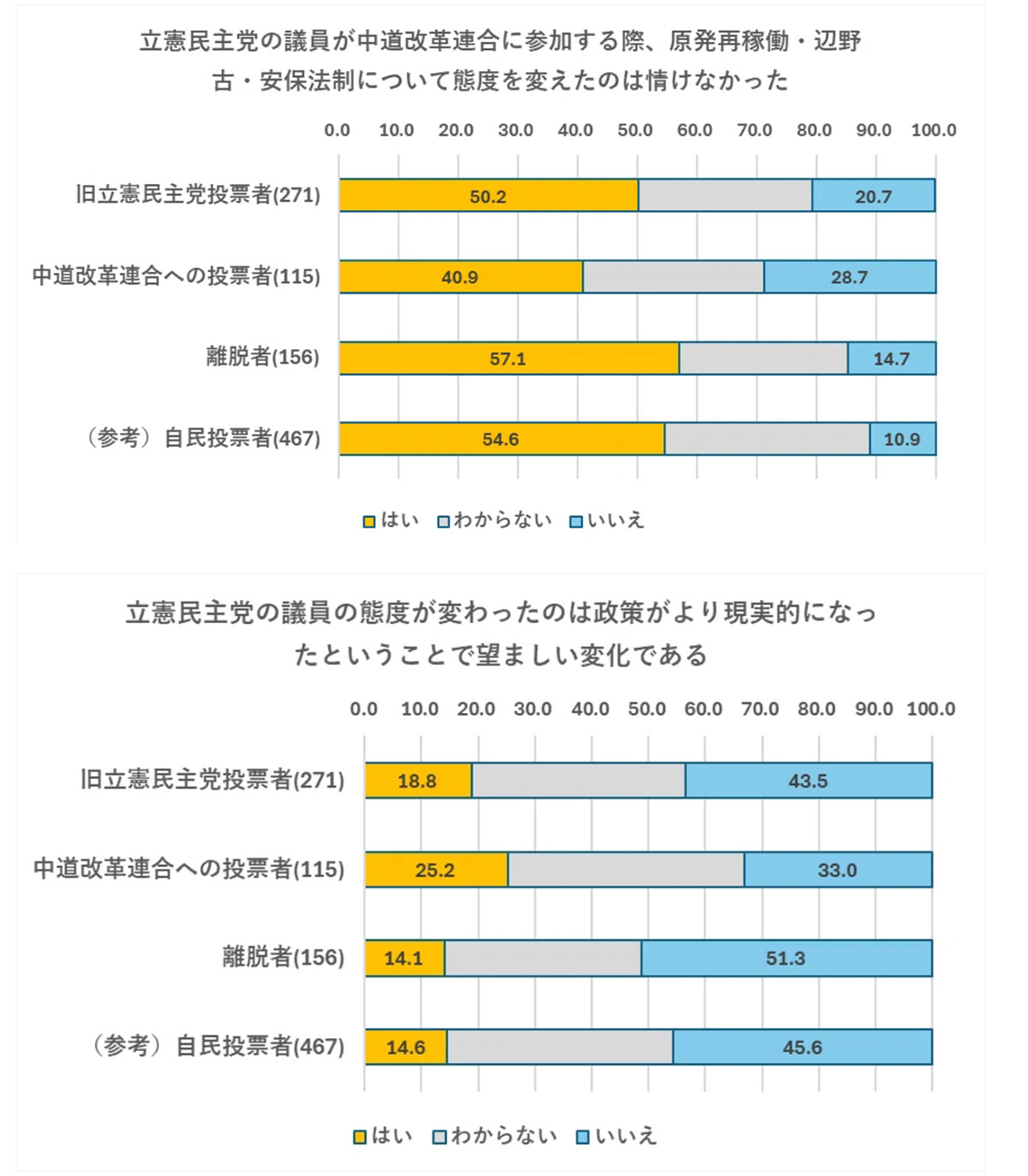 しかし、注意すべきなのは離脱している人は立憲民主党支持層の中でも保守寄り、すなわち中道寄りで、原発再稼働・辺野古移設・安保法制を容認している人であることである。すなわち離脱者は、議員たちが自分たちと同じ意見に変えているのにそれを情けないと感じて離脱しているのである。