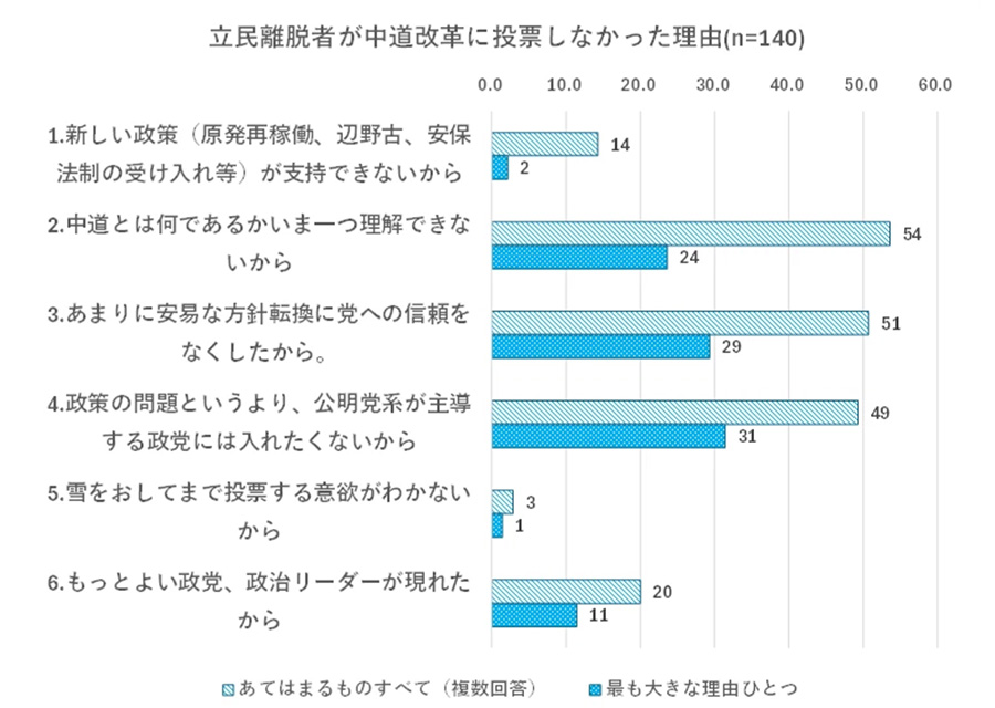 二つ目は「3.あまりに安易な方針転換に党への信頼をなくしたから」というもので、昨日までの方針を急に変えたことへの戸惑いである。この二つの理由は急に中道を立ち上げたから生じたことで、時間さえかければ解消できる可能性がある。