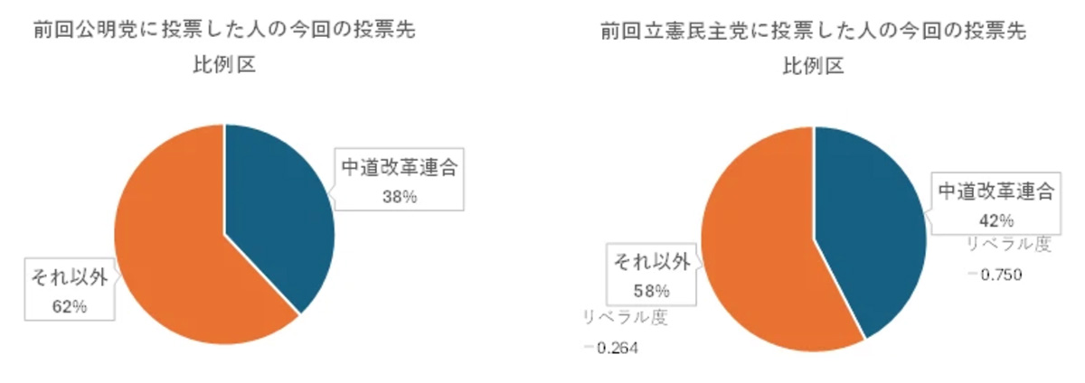 実際、高市自民は右に振れたので、前回自民党に投票した人のうち3割は自民党への投票をやめている。リベラル勢力は彼らを吸収すればよい。野田党首が中道へのシフトを決めたのは正しい判断であるし、中道リベラルの位置にいるのは公明党なので、公明党と組むのも正しい判断であろう。