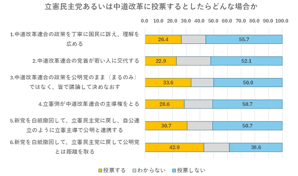 この三つのなかにどれか主因があるだろうか? この点を明らかにするため。さらに設問を重ねた。より踏み込んで意識を探るためだ。仮にどんな条件がそろえば、離脱を取り消して復帰するかを聞いてみた。これは中道改革連合から見れば、離脱者の奪還の条件を聞くことである。問はつぎのとおりである。