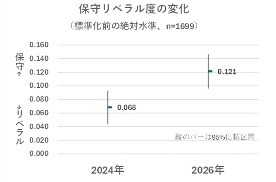 本稿で使っている保守リベラル度(前稿の補論参照)で見ても保守への移行傾向は確認できる。図2-9は今回のサンプル1699人の保守リベラル度の平均値を2024年と2026年で比較したものである。図からわかるように0.068から0.121にわずかではあるが有意に保守度が上昇している。