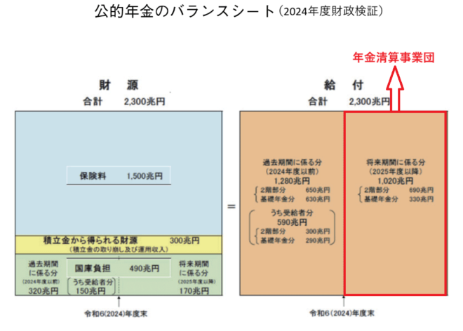 これはある意味では正しい。図のように賦課方式の財源と給付を1対1に対応させると、年金債務2300兆円のうち過去に払った債務1280兆円を除く将来の支払い(年金純債務)が1020兆円もあるからだ。