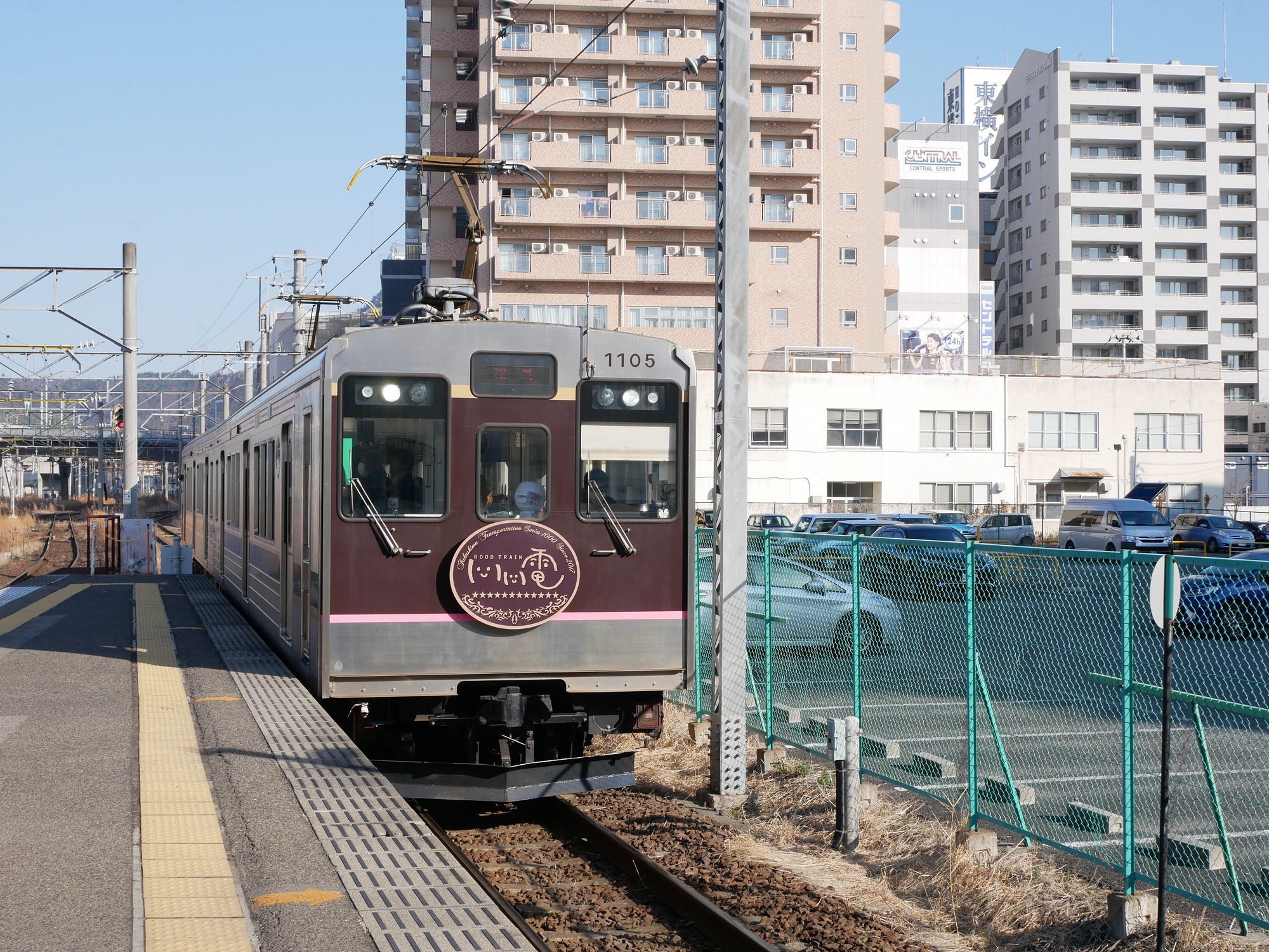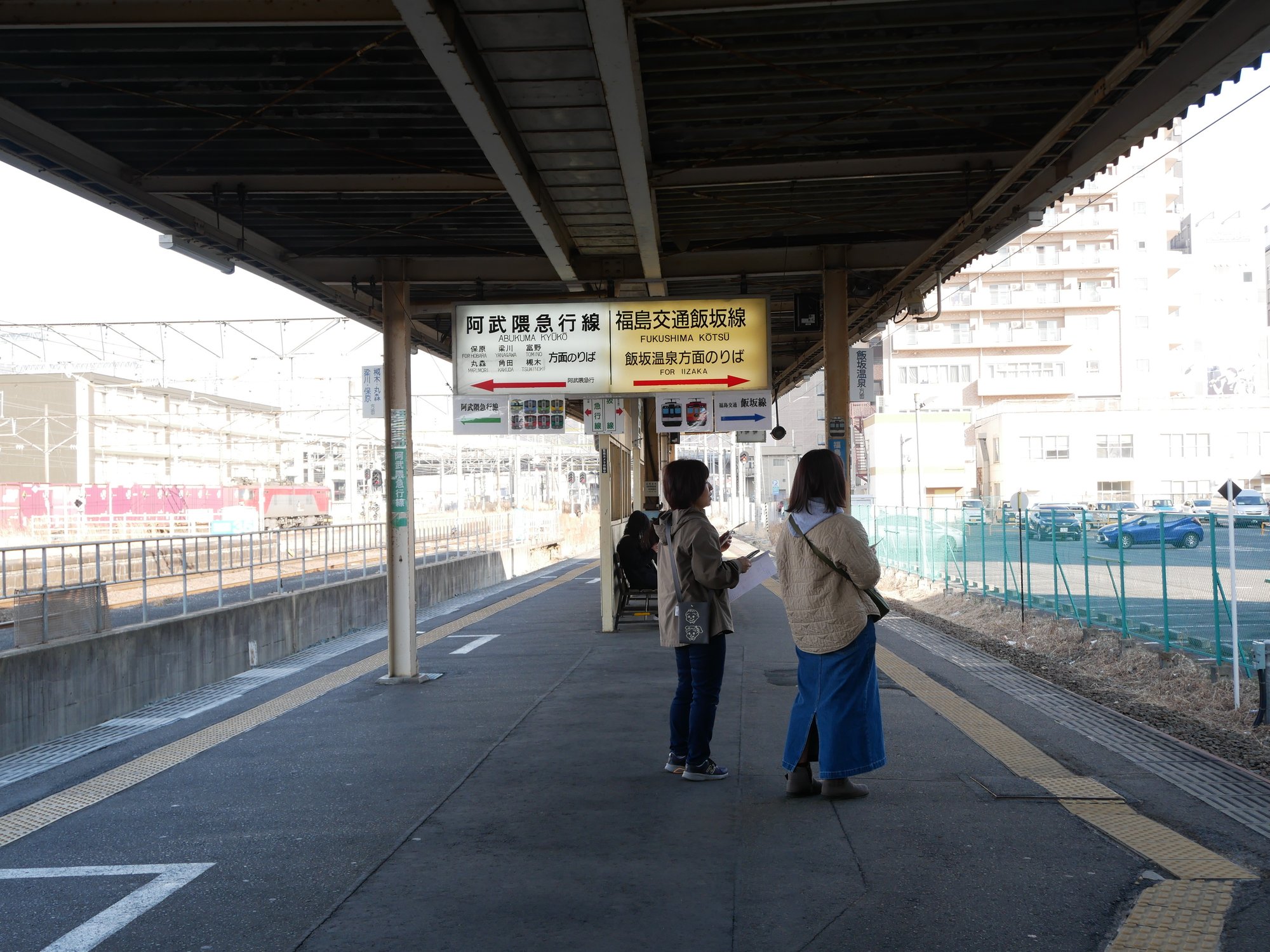 少しの待ち時間で電車がやってきました。福島交通飯坂線は福島駅と飯坂温泉駅を結ぶ路線。飯坂温泉は福島市の奥座敷で古くから温泉街として発展しています。