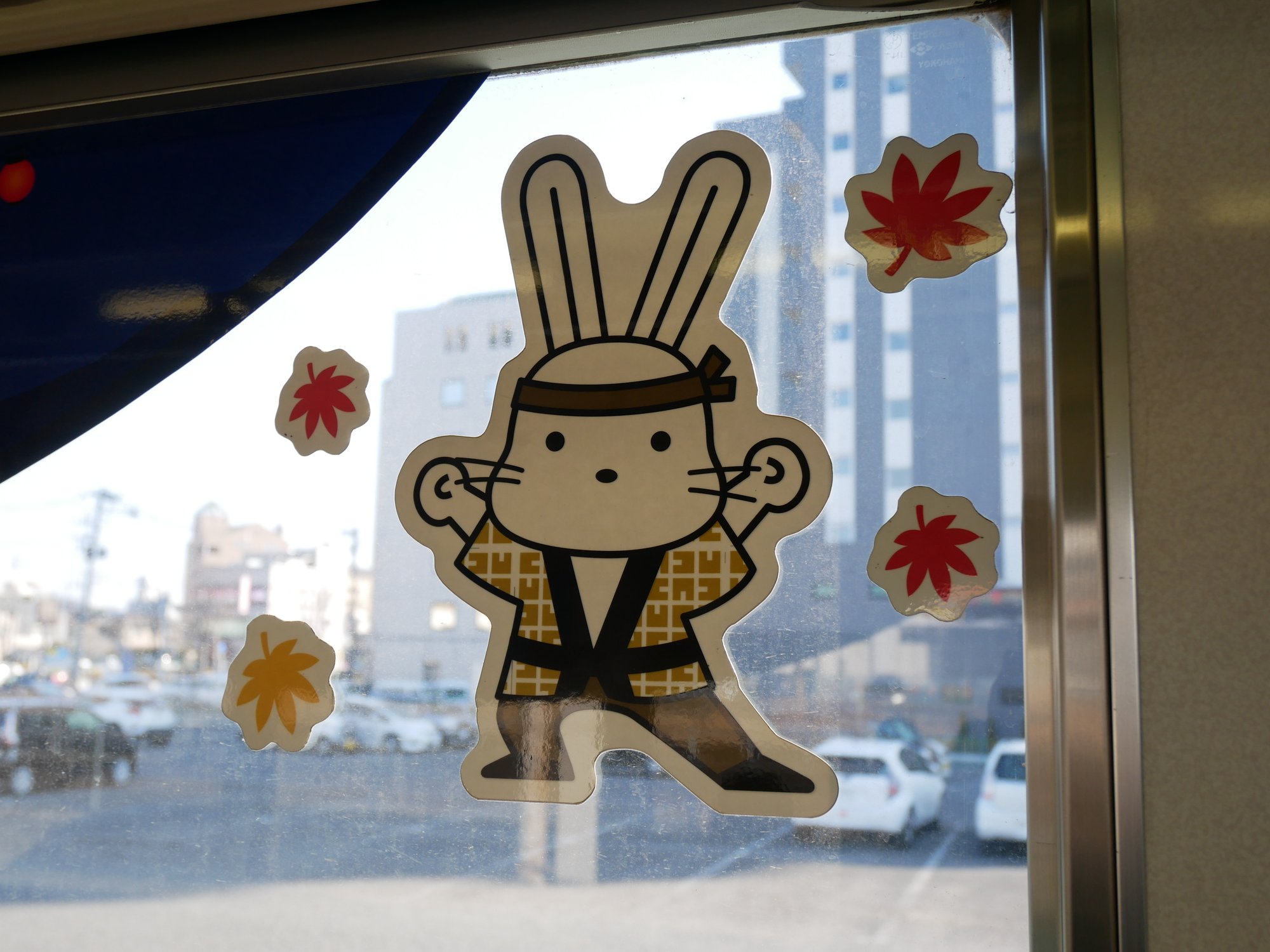 車内にはこんなかわいいうさぎのステッカーが張られています。こちらは福島の観光キャラクター「ももりん」。福島名産のももとりんごから命名されていて、福島の観光の魅力を発信してくれています。