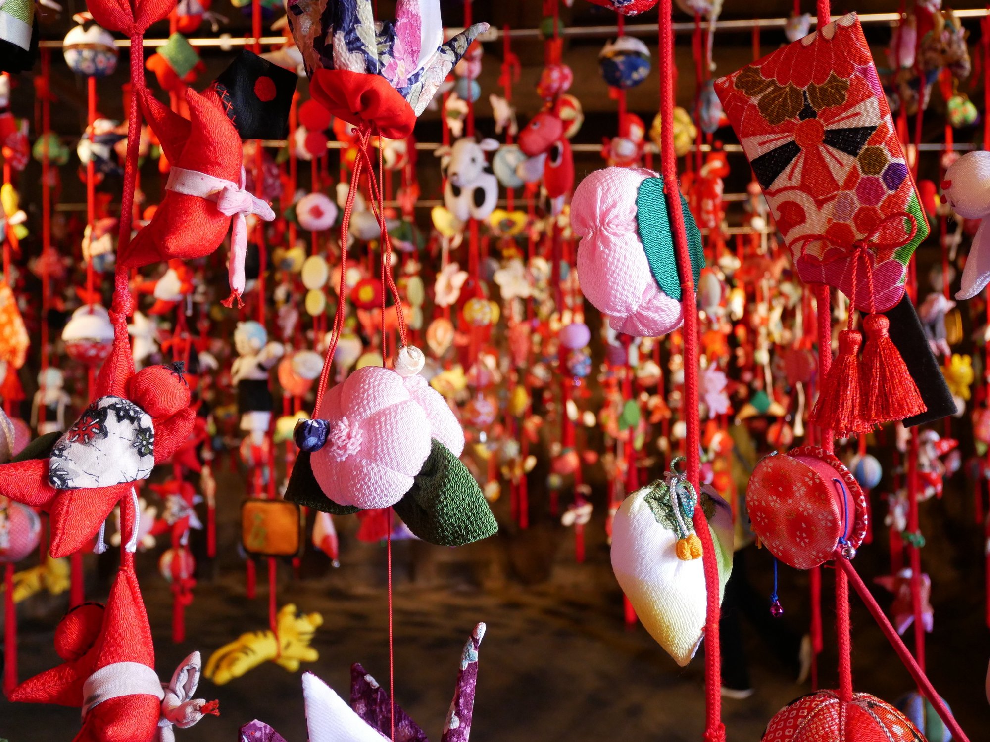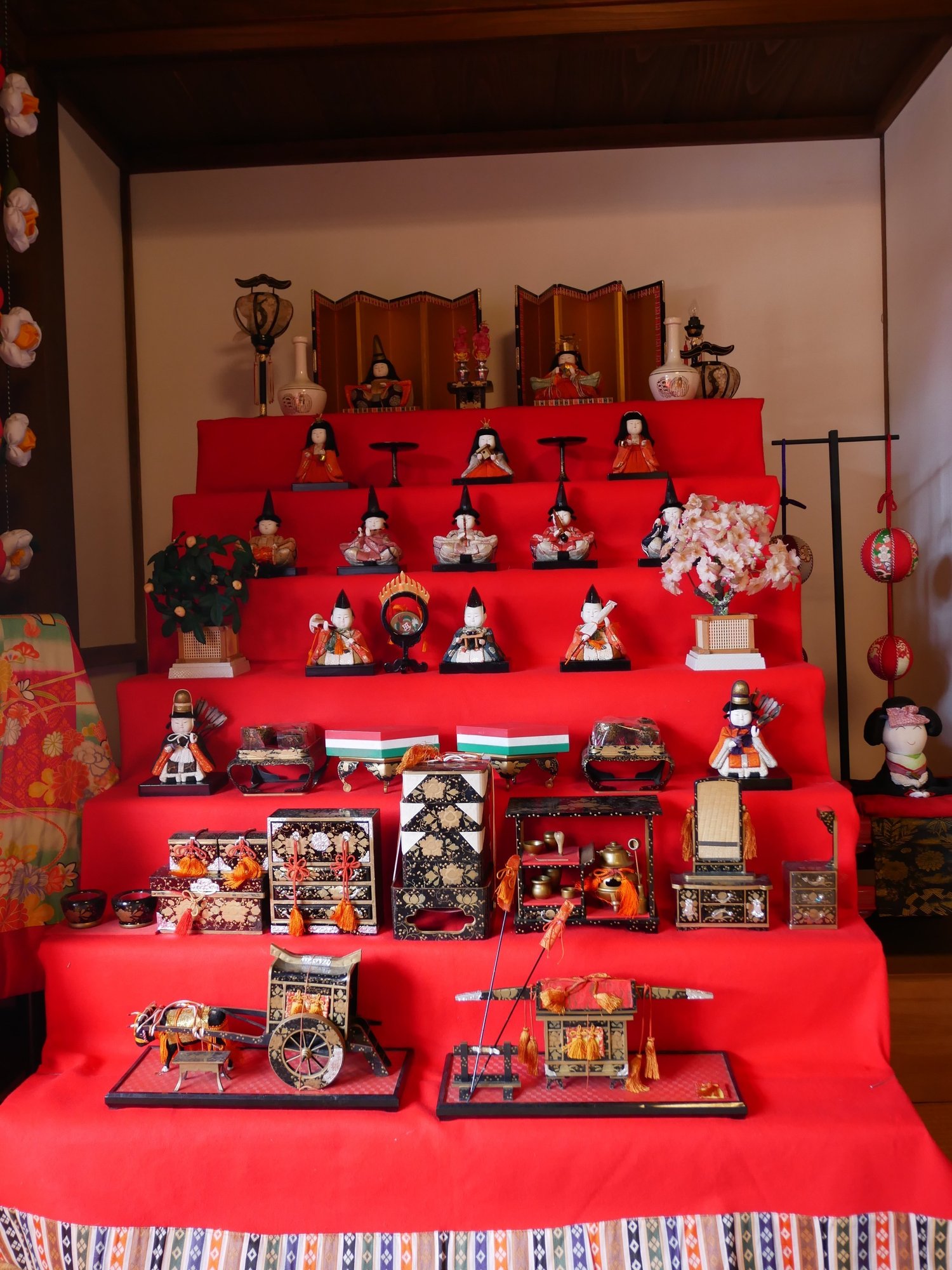 私が訪ねたときはひな祭り前ということもあって、母屋などにひな人形が飾られていました。大小さまざまなひな人形が古い邸宅の春を彩ります。つるし雛飾りもひな人形の前に飾られていて、より一層派手にひな祭りを祝い、子供の成長を願う様子が窺えました。
