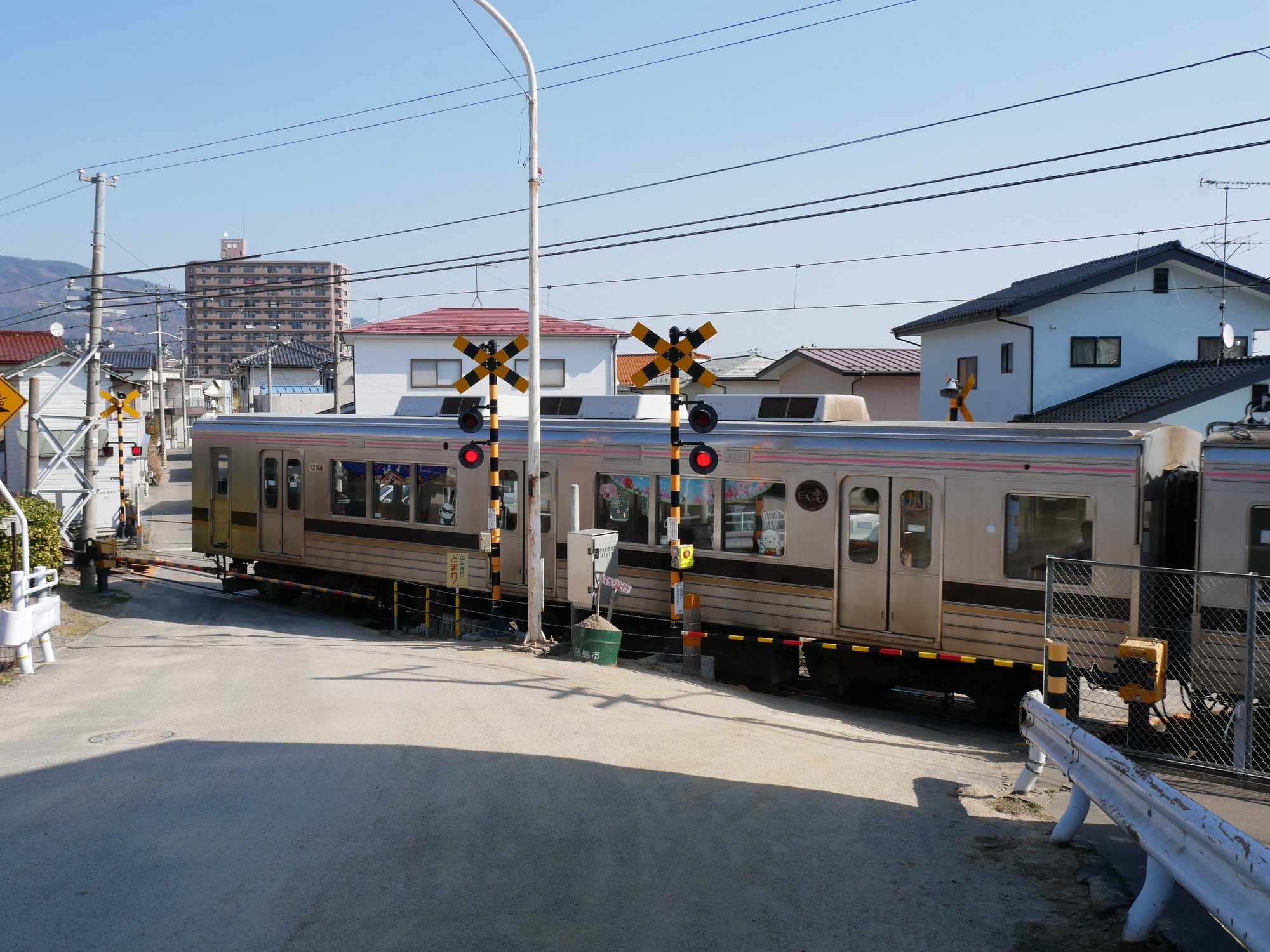 温泉でさっぱりしながら、帰りは飯坂温泉を通り過ぎ、ひとつ先の花水坂駅から帰りました。ちょうど2本の道路が分岐する場所に線路が通っているので2つ隣り合わせで踏切が並びます。これ、なかなか珍しい景色ではないでしょうか。