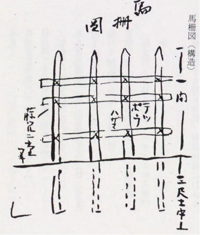 また『武功夜話』所収の「永禄洲俣記」にも、同様の馬防柵の図が掲載されているが、「土中」の部分に平行な斜線を細かく引いている。地中であることを強調するための近代的な描画表現であり、戦国・江戸期の絵図には見られない。
