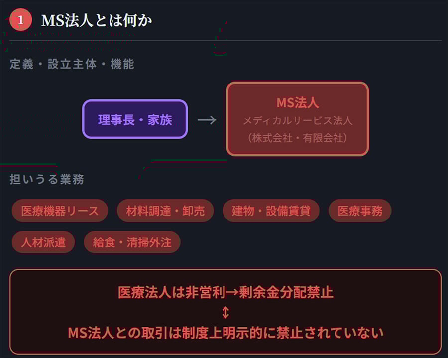 MS法人とは「メディカルサービス法人」の略称で、医療法人が直接行えない営利事業を担う目的で理事長やその家族が設立する株式会社・有限会社である。医療機器のリース、材料の調達・卸売、建物・設備の賃貸借、医療事務・人材派遣、給食・清掃の外注など、医療周辺のあらゆる業務を担いうる。