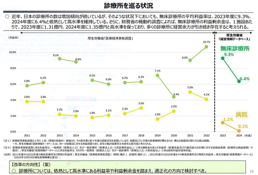 財務省の財政制度等審議会資料(2025年11月5日)が示す事実から始める。無床診療所の利益率は2023年度で9.3%に達した。病院の利益率1.2%の約8倍である。2024年度は6.4%とやや低下したものの依然として高い水準だ。1施設あたりの利益剰余金は1.31〜1.35億円にのぼる。