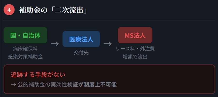 コロナ禍の病床確保料・感染対策補助金などは医療法人に交付される。しかしその後、医療法人がMS法人へのリース料・外注費を増やすことで資金が外部に流出しても、追跡する手段がない。公的補助金の実効性検証が、制度上不可能になっている。