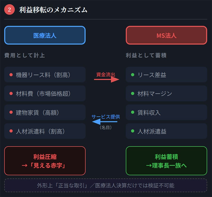 典型的なスキームはこうだ。理事長が設立したMS法人が、医療法人に対して医療機器を割高でリースする。材料を市場価格より高く販売する。建物を高い家賃で貸し付ける。医事業務の人材を割高な派遣料で供給する。