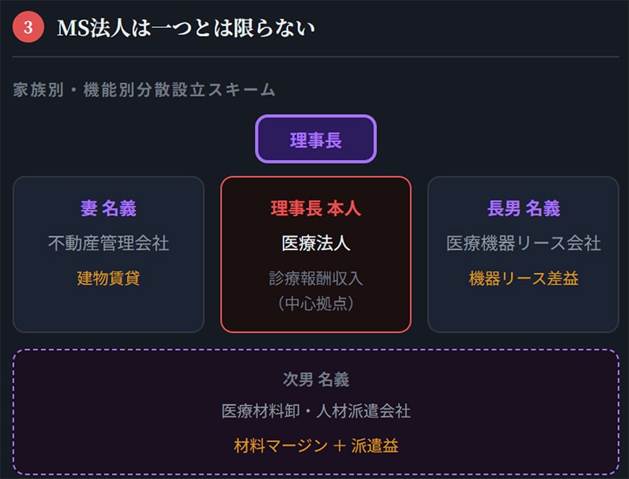 妻名義で不動産管理会社(建物賃貸)、長男名義で医療機器リース会社、次男名義で医療材料卸・人材派遣会社——親族ごとに機能別に設立すれば、グループ全体の利益移転規模は合算しなければ見えない。
