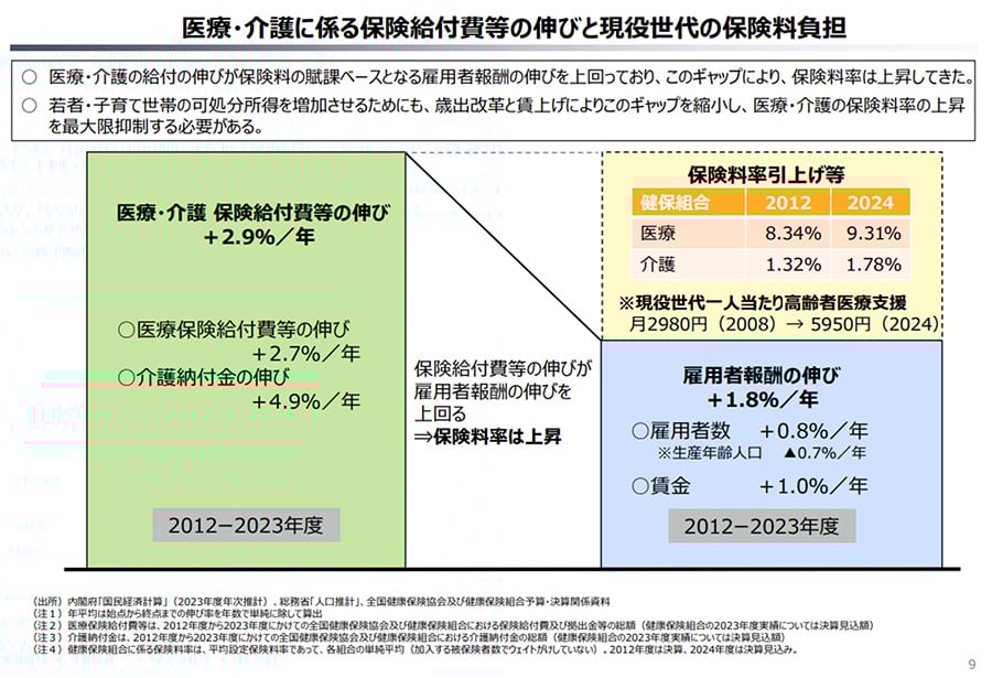 診療所が利益率9.3%を計上しながら、現役世代の負担は倍増し、給付の伸びは賃金の伸びを大幅に上回り続けている。