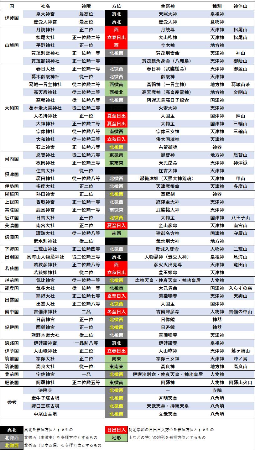 表‐1は、延喜式神明帳(927年)に掲載された神階二位以上の由緒ある神社の参拝方位を、主祭神・神種・神体山とともに示したものです。