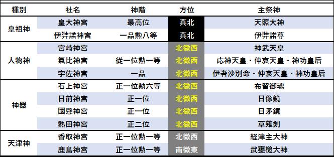 表‐1 延喜式神明帳における神階二位以上の古社の参拝方位