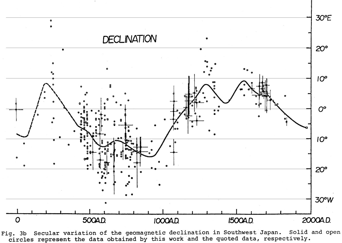図‐4 西南日本での地磁気の偏角の永年変化(Shibuya 1980)