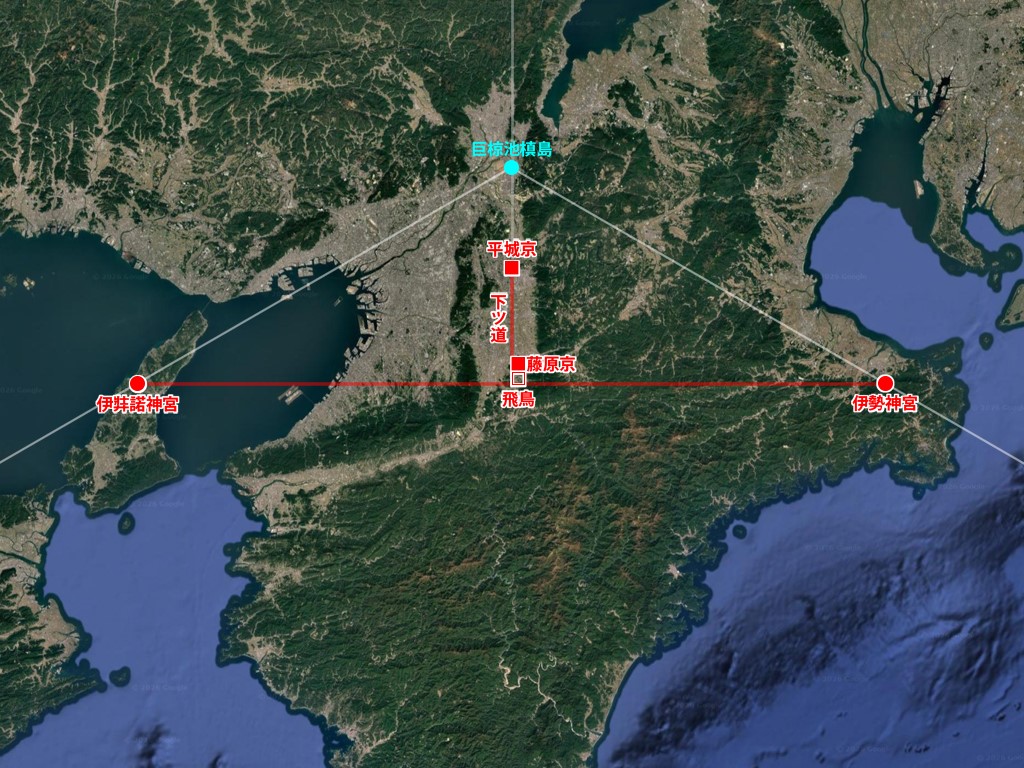 なお、距離を決定するには、三角測量が必要ですが、中国では既に三国時代(3世紀)には三角測量の理論が存在しており、中国と交流があった7世紀の日本でこのレイアウトを実現することは不可能ではありません。聖徳太子が遣隋使を派遣したのは7世紀初頭の600年~618年です。例えば、下ツ道の延長線上にある巨椋池の主要な島である槙島から冬至の日出方位と東西線の交点に伊勢神宮、冬至の日入方位と東西線の交点に伊弉諾神宮を座取りすれば、このレイアウトを構築することができます。