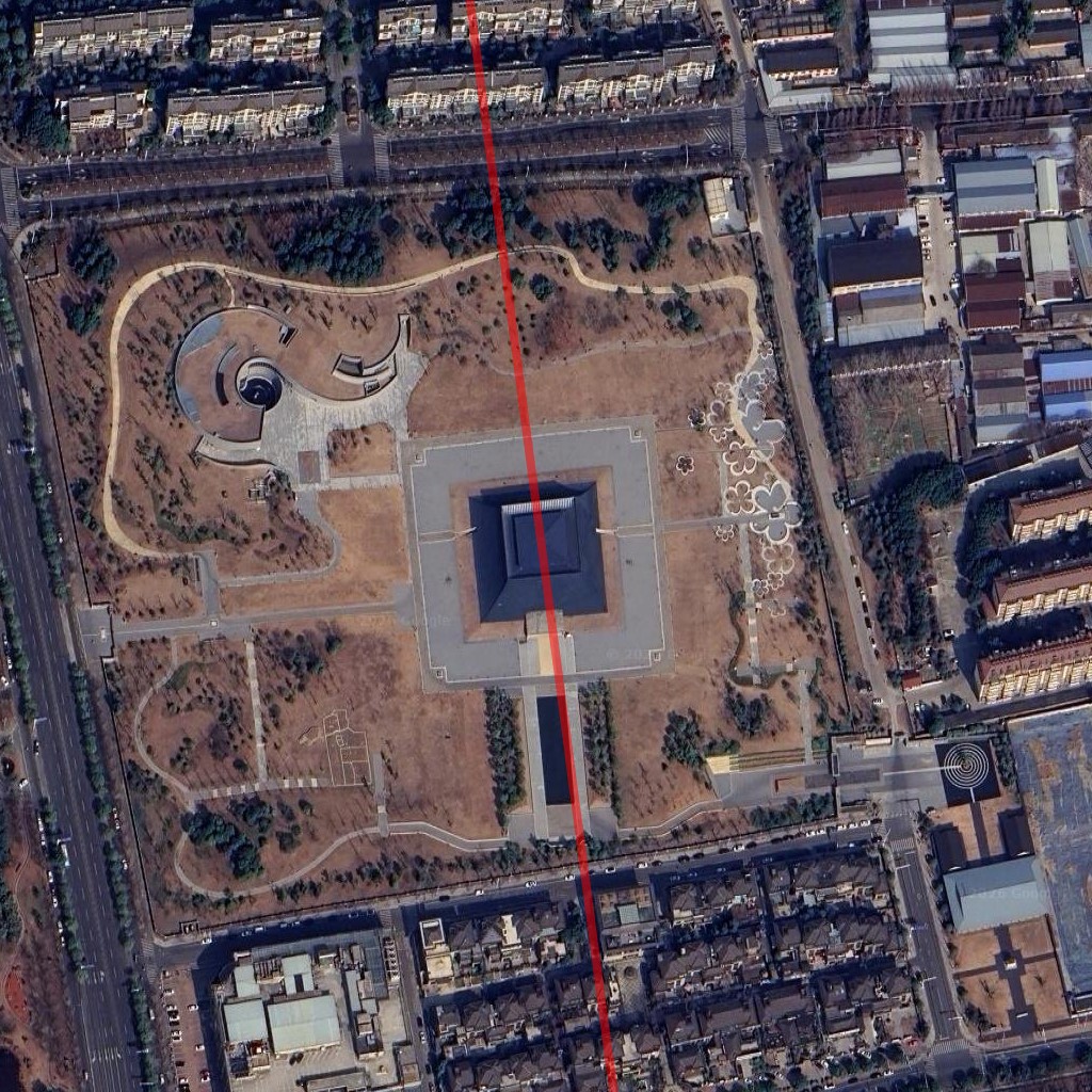 さらに、2013年に出土された煬帝の石棺も概ねこの方位を向いていることがわかっています。正確な測量図を確認していないので確定はできませんが、石棺に概ね平行に建築されたと考えられる上物構造物の方位が概ねこの方位と一致しています(図-6)。