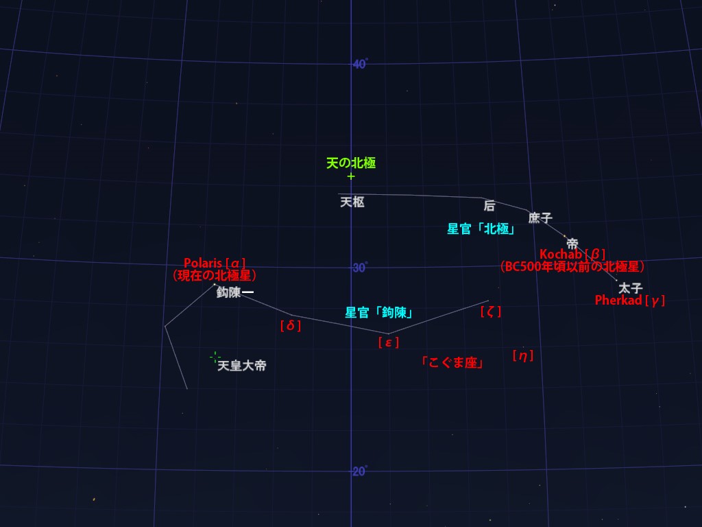中国では、星の回転運動の中心である天の北極を宇宙の中心と考えていました。西暦500年頃まで、この天の北極に最も近い2等星がこぐま座ベータ星のコカブでした。コカブは、星官(中国の星座)「北極」の第一星である「帝」と呼ばれ、皇帝の星(帝星)として崇拝されていました。しかしながら、遣隋使が煬帝に謁見した608年には、天の北極に最も近い2等星は、現在の北極星であるこぐま座アルファ星のポラリスに代わっていました。