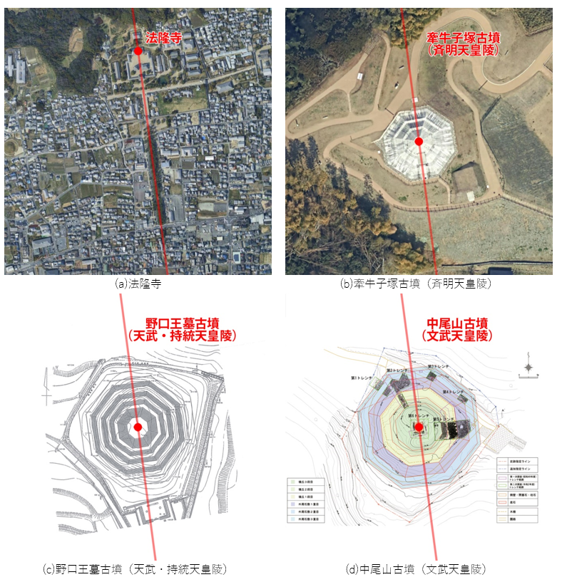 また、併せて注目したいのが、聖徳太子によって飛鳥時代初期の607年に創建された法隆寺の参拝方位、そして飛鳥時代後半のメインストリームの天皇といえる斉明天皇・天武天皇・持統天皇・文武天皇の天皇陵である八角墳の埋葬方位も正確に7.5度西偏しているという事実です(図-3)。