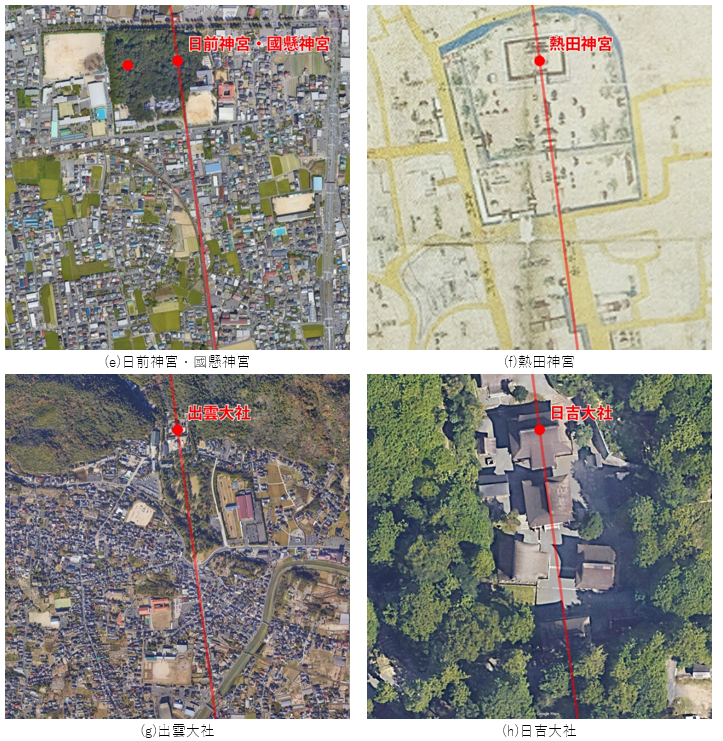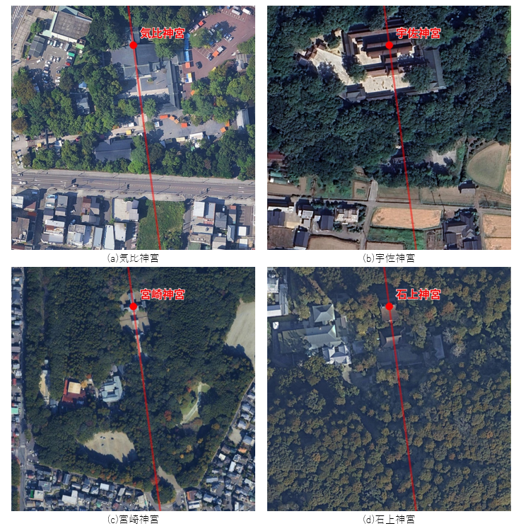 一方、東西線の精度については、伊弉諾神宮と伊勢神宮の位置から検証することができます。伊弉諾神宮(北緯34.460度、東経134.852度)と伊勢神宮は(北緯34.455度、東経136.725度)は、経度の差が1.873度(170km)であるのに緯度の差は僅か0.005度(570m)です。素直に考えれば、この2つの神社は、大和王権・大和朝廷が意図的に飛鳥の東西に配置したと考えられます。この2社を通る線は、まさに【レイライン ley line】であり、東西線からの偏差は僅か0.2度です。