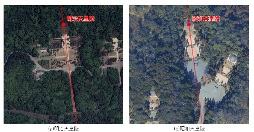 …という言葉で締めようと思っていましたが、遠く離れた後の時代に、この参拝方位が密かに復活していた事例を見つけてしまいました。それは、この2つの天皇陵です(図-8)。