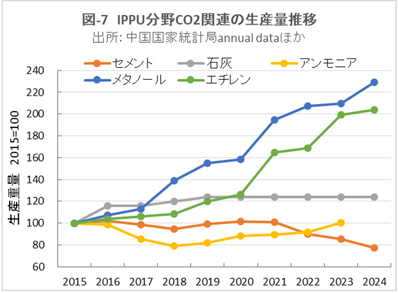 図-7に、2015年の生産量を100として生産量の推移を示しました。2025年以降の想定が難しいのは、近年の生産量変化が大きいセメントと石油化学です。その他の生産量は、過去のトレンドを参考に想定しました。