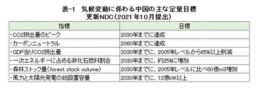 表-1に、パリ協定に関して中国が2021年に提出した更新NDCを示しました。2030年までにCO2排出量をピークにするとともに、GDP当りCO2排出量を2005年レベルから65%以上削減する目標としています。