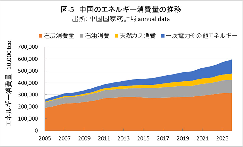 中国のCO2排出量が増加するのは、経済成長によりエネルギー消費が増加するためです。図-5に総エネルギー消費量の実績を示しました。中国国家統計局(NBS)が公表しているデータです。本稿では、できるだけ中国の公的機関が公表しているデータを使用しました。
