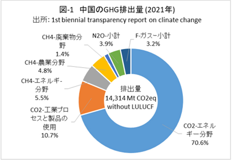 中国の温室効果ガス(GHG)やCO2の排出概要を示すため、図-1、図-2に2021年の内訳を示しました。パリ協定に基づき中国が提出した ”First Biennial Transparency Report on Climate Change(December 2024)” に記載されたデータです。